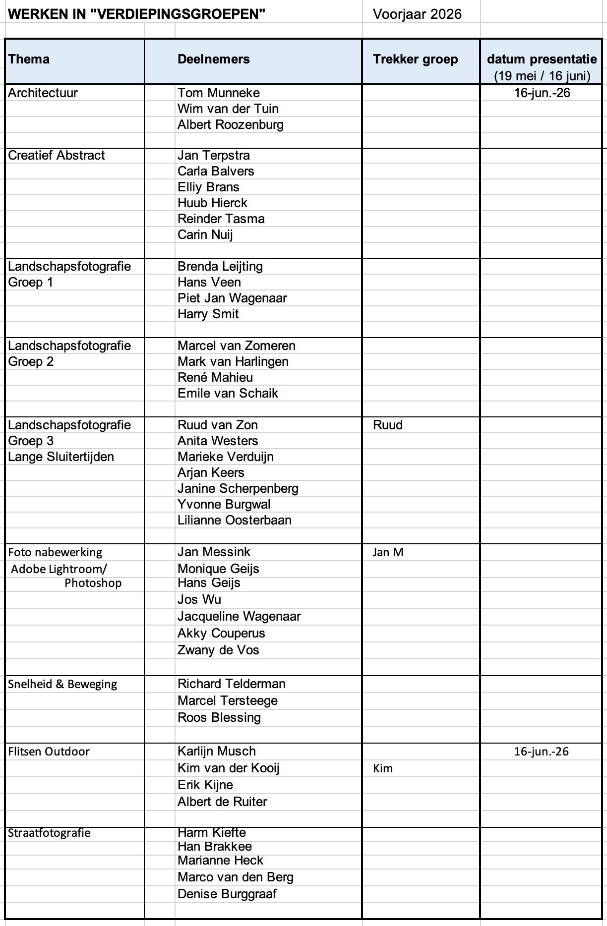 Deze avond kan gebruikt worden voor de eerste groepssessie inzake de eigen verdiepingsgroep. Na afgelopen week zijn de groepen nog wat aangepast (onder deze nieuwsbrief tref je het overzicht aan). Nog niet alle groepen hebben gemeld wie hun ‘trekker’ is en wanneer ze denken te presenteren. Graag even een reactie aan Albert hierover (programma@almeersefotoclub.nl).